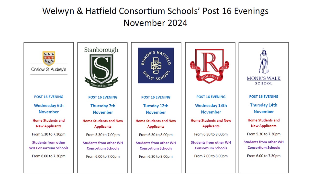 Ridgeway Academy Sixth Form is proud to be part of the Welwyn Hatfield Consortium so that we are able to offer you the widest range of subjects. If you are considering studying a subject that is taught at another site within the consortium and would like to find out more, you may wish to visit their open evening: